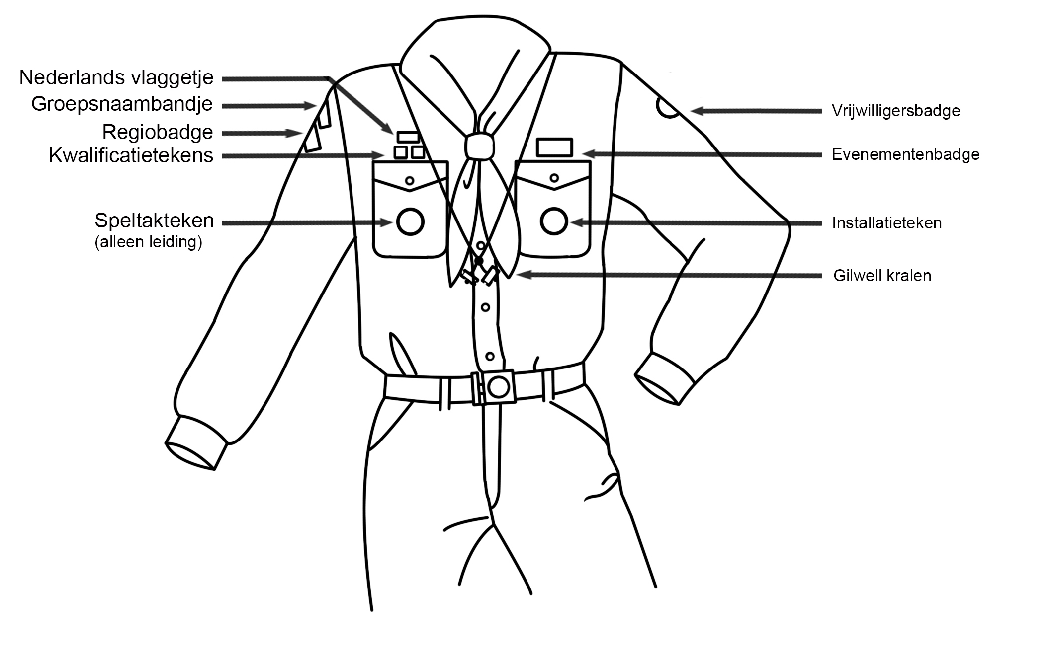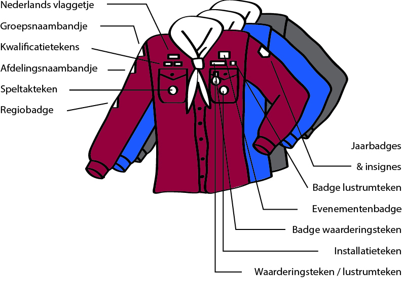 | Speltakteken | Het “Speltakteken” moet in het midden van de rechterborstzak. |